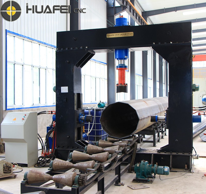 龍門式塔桿液壓合縫機(jī)主要由HX1600鋼管合縫機(jī)一臺(tái),輸送滾料道一套、液壓站一套、電氣控制柜一套組成。HK160鋼管合機(jī)最大工作長(zhǎng)度12000mm,HX1600鋼管合縫機(jī)(即主機(jī)),有效寬度為1600mm,有效高度為1680mm,中心高可在780mm和1450mm之間自由調(diào)整。對(duì)于小于920mm的鋼管,應(yīng)換上主油缸壓頭接長(zhǎng)桿才能完成施工。