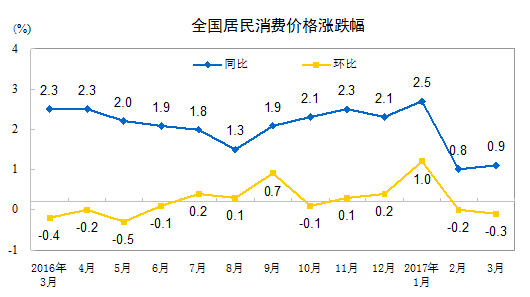 中國經(jīng)濟(jì)網(wǎng)北京4月12日訊 2017 年 3 月份,全國居民消費(fèi)價(jià)格總水平同比上漲 0.9% 。其中,城市上漲 1.0% ,農(nóng)村上漲 0.6% ;食品價(jià)格下降 4.4% ,非食品價(jià)格上漲 2.3% ;消費(fèi)品價(jià)格下降 0.1% ,服務(wù)價(jià)格上漲 2.7% 。一季度,全國居民消費(fèi)價(jià)格總水平比去年同期上漲 1.4% 。