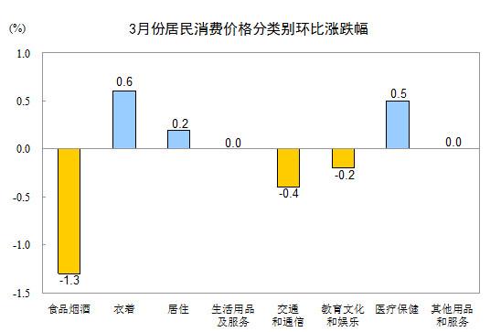 3 月份,全國居民消費(fèi)價(jià)格總水平環(huán)比下降 0.3% 。其中,城市下降 0.3% ,農(nóng)村下降 0.4% ;食品價(jià)格下降 1.9% ,非食品價(jià)格上漲 0.1% ;消費(fèi)品價(jià)格下降 0.5% ,服務(wù)價(jià)格上漲 0.1% 。