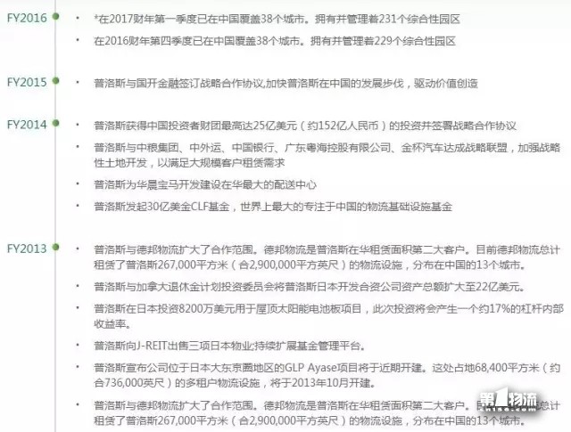 普洛斯致力于為全球最具活力的制造商、零售商和第三方物流公司不斷提高供應(yīng)鏈效率,達(dá)成戰(zhàn)略拓展目標(biāo);通過(guò)全面的開(kāi)發(fā)、運(yùn)營(yíng)、基金管理和金融服務(wù),促進(jìn)領(lǐng)先的物流生態(tài)圈發(fā)展。其主要發(fā)展歷程及合作項(xiàng)目如下: