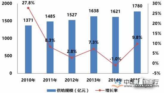 2010-2015年間中國商用冷鏈?zhǔn)袌鲆?guī)模整體處于上升態(tài)勢,供給規(guī)模從2010年的1371億元增長至2015年的1780億元;但是,2010-2015年期間,中國商用冷鏈供給規(guī)模增長率波動較大,其中2014年的供給規(guī)模下降1.0%,商用冷鏈供給規(guī)模的下降主要是由商用冷柜等相關(guān)產(chǎn)品供給規(guī)模下跌導(dǎo)致。