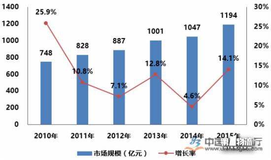 受到零售、食品、冷鏈物流行業(yè)等發(fā)展影響,2010-2015年,中國商用冷鏈?zhǔn)袌霰3种粩嘣鲩L的態(tài)勢,但是受到宏觀經(jīng)濟(jì)和市場需求波動等不穩(wěn)定因素的影響,增長率有較大幅度的波動。