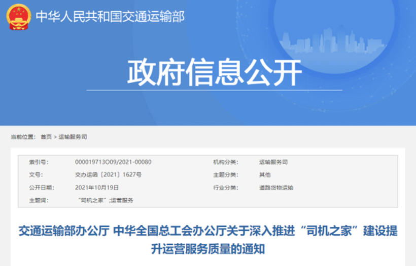 10月19日,交通運(yùn)輸部網(wǎng)站發(fā)布《交通運(yùn)輸部辦公廳 中華全國總工會(huì)辦公廳關(guān)于深入推進(jìn)“司機(jī)之家”建設(shè)提升運(yùn)營服務(wù)質(zhì)量的通知》,要求各級(jí)交通運(yùn)輸主管部門、工會(huì)組織因地制宜開展“司機(jī)之家”建設(shè)運(yùn)營,推出讓貨車司機(jī)愿意用、用得起的餐飲、停車、休息、洗浴、洗衣等服務(wù),加強(qiáng)對(duì)已投入運(yùn)營“司機(jī)之家”服務(wù)質(zhì)量的跟蹤監(jiān)測,切實(shí)改善廣大貨車司機(jī)停車休息環(huán)境和條件。