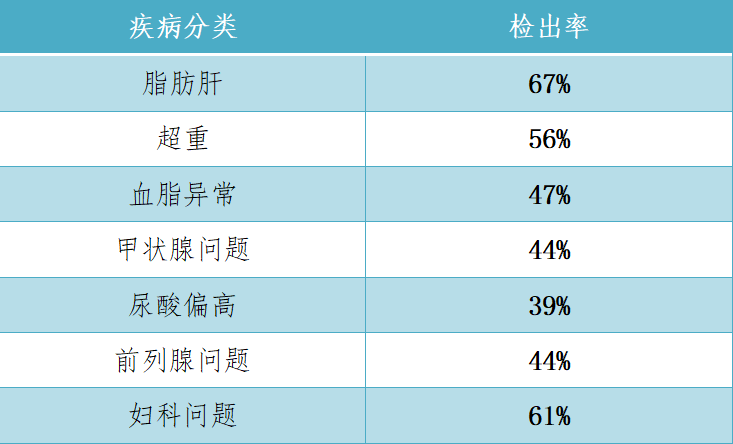 本次體檢統(tǒng)計顯示,發(fā)病高居榜首的是脂肪肝(約占67%),第二位的是超重(約占56%),第三位的是血脂異常(約占47%),第四位的是甲狀腺問題(約占44%),第五位的是尿酸偏高(約占39%)。另外,男員工前列腺問題(約占44%),女員工婦科問題(約占61%)。
